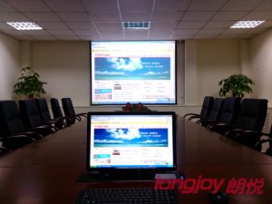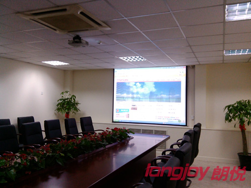 在該項(xiàng)目中,朗悅科技采用了高亮度投影機(jī)及100寸投影幕,高清、高亮度的投影投射到超大投影幕中,極大提升了會(huì)議室的整體顯示效果。同時(shí)在會(huì)議室主位上還安裝了電動(dòng)升降屏,便捷主講人的操作體驗(yàn)。