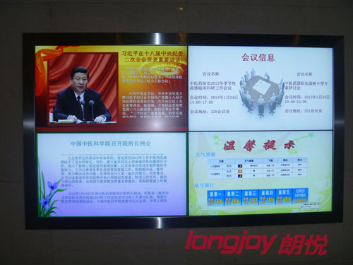 出于對學術嚴謹的考慮及方便各院士之間相互交流及溝通,中國中醫科學院籌備安裝遠程信息發布系統,經過慎重考慮,北京朗悅創新科技有限公司憑借成熟的大屏系統施工經驗爭取到了該工程。信息發布系統由服務器、網絡、播放器、顯示設備組成,將服務器的信息通過網絡(廣域網/局域網/專用網都適用,包括無線網絡)發送給播放器, 再由播放器組合音視 頻、圖片、文字等信息(包括播放位置和播放內容等),輸送給液晶電視機等顯示設備可以接受的音視頻輸入形成音視頻文件的播放,這樣就形成了一套可通過網絡將所有服務器信息發送到終端的鏈路, 實現一個服務器可以控制全市、全國、甚至全世界的網絡廣告機終端,那就可以在世界的任何一個有網絡覆蓋的位置都可以實現廣告的發布,省得不只是人工費用,而且使得信息發布達到安全、準確、快捷 ,在競爭激烈的現實社會要求通過網絡管理、發布信息這一趨勢已經基本形成。中國中醫科學院通過遠程信息發布系統可以實時獲取最新的資訊,同時還可以與全國各地的權威人士“面對面”進行學術研討。