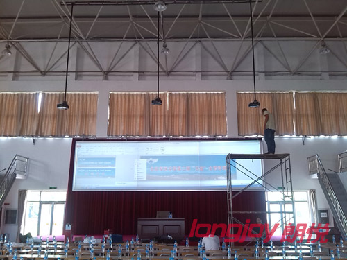 經過前期的考察,空軍某部隊決定采用朗悅科技所提供的大禮堂投影顯示方案,在禮堂內部采用三臺高亮度投影機拼接,達到6米寬的畫面,從而完全滿足于部隊對于大尺寸畫面顯示的要求,鑒于會堂現場結構復雜,施工難度大,北京朗悅科技有限公司多次派相關技術人員進行現場勘查記錄,推出多款施工方案,最終經過朗悅銷售人員與技術人員3晝夜的艱苦奮戰,客服了重重困難,如期完成投影顯示工程,出色的工程質量與良好的應用體驗得到了部隊領導的一致好評。