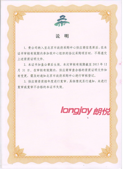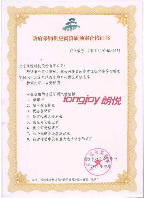 朗悅科技順利獲得2014年度北京市政府采購(gòu)中心頒發(fā)的政府采購(gòu)供應(yīng)商資質(zhì)合格證書。