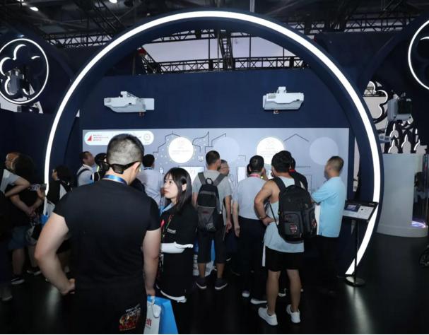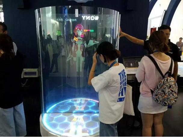 此展區以模擬仿真投影為靈感,在透明柱形空間中對半透明玻璃進行投影,從而獲得影像懸浮于空中的全息般視覺效果。其中,投影屏幕采用了麥克賽爾研發的業內領先的具備隔熱阻熱功能的半透明屏幕膜,實用性和美觀度兼具。二次元人物的可愛造型和虛幻漂浮的效果,讓展項前的觀眾不時舉起手機拍攝。
