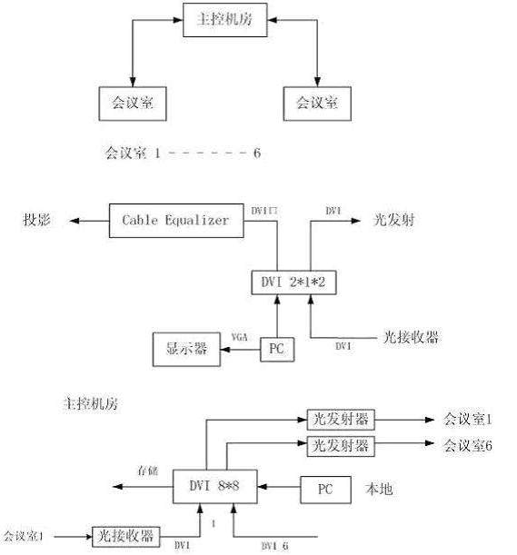 會議室距機房的距離在120—200米左右不等,考慮到電磁環境差,又要保證圖像質量(最大分辨率1280×1024)因此干線傳輸利用光纖傳輸系統,即可保證圖像質量又可解決電磁環境問題。